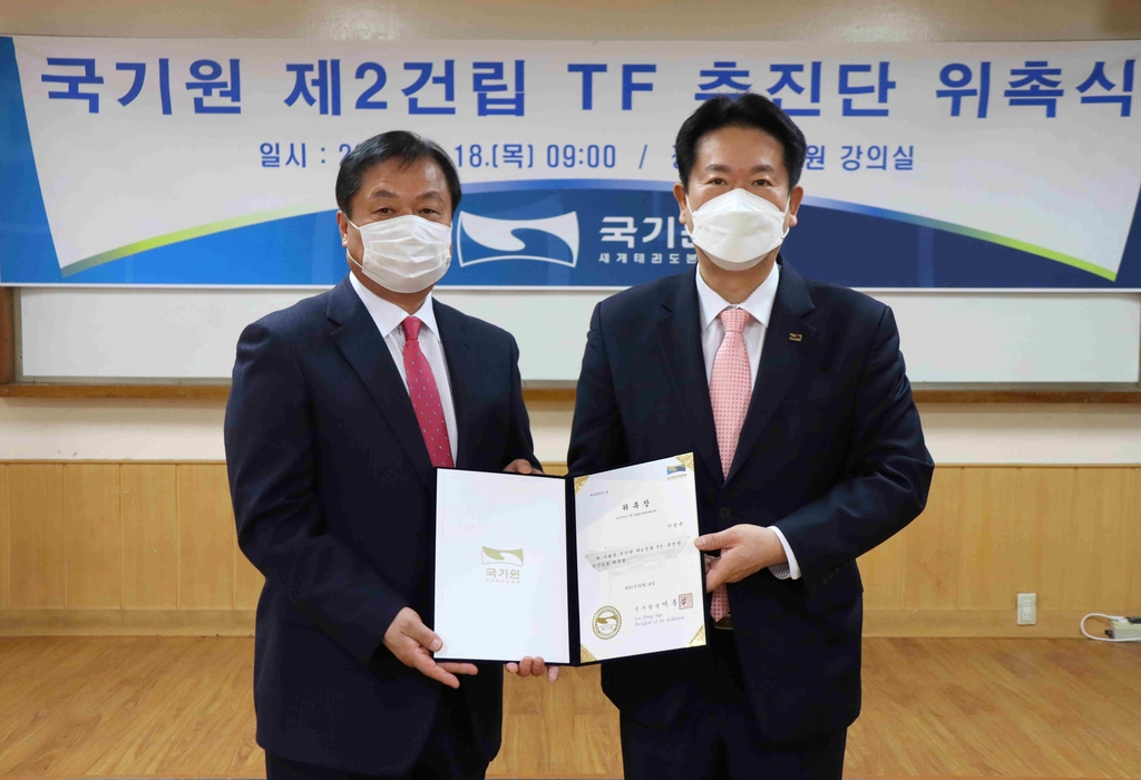 | ▲ 국기원 제2건립 TF 추진단 구성. 이동섭 국기원장(오른쪽)과 '국기원 제2건립 TF 추진단' 단장으로 위촉된 안용규 한국체대 총장. [국기원 제공. 재판매 및 DB 금지] |