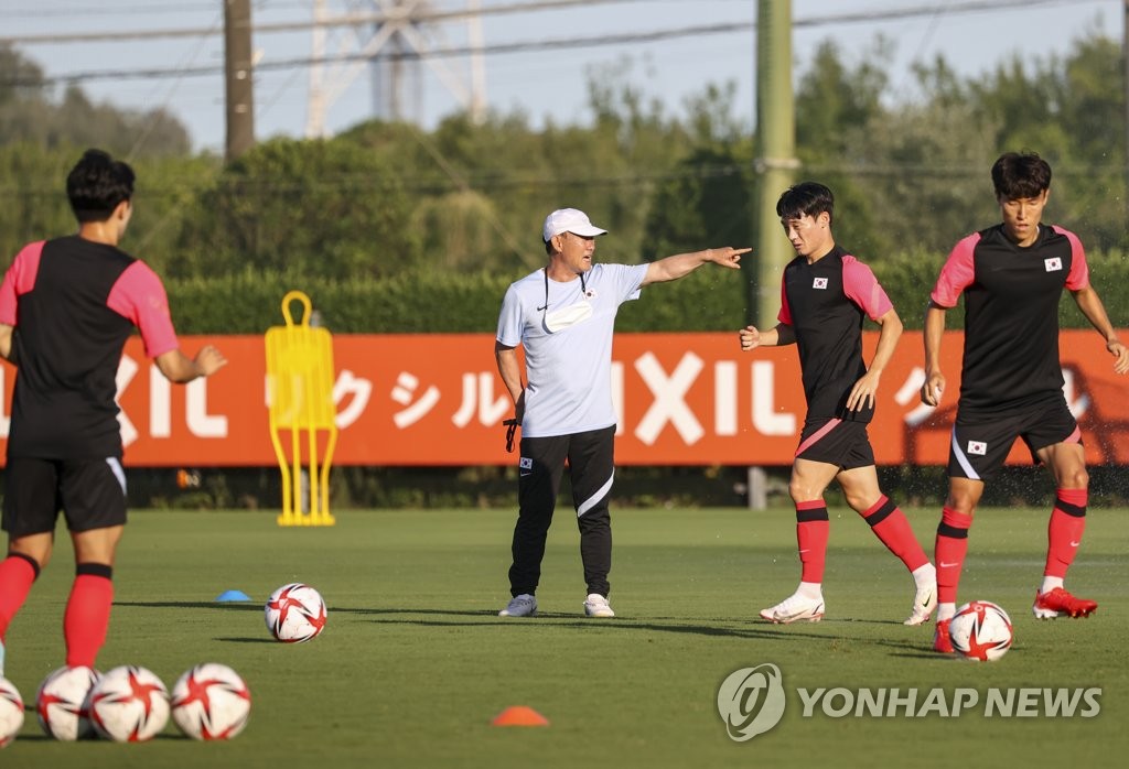 | ▲ Kim Hak-bum (C), head coach of the South Korean men's Olympic football team, directs his players during practice at Kashima Antlers Clubhouse in Kashima, Japan, on July 19, 2021. (Yonhap) |