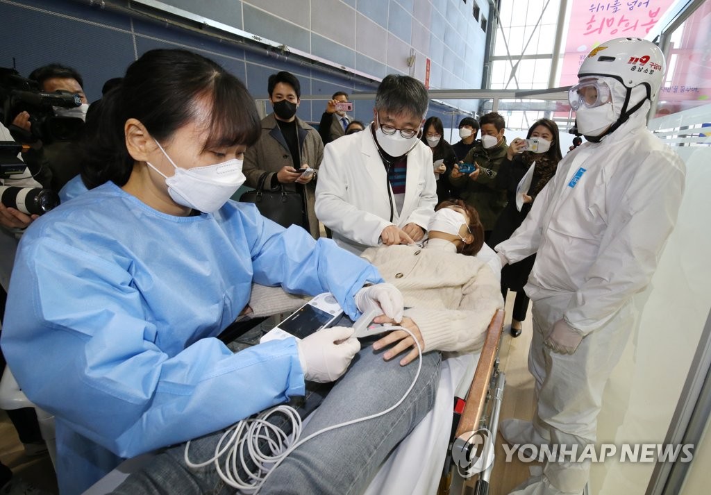 | ▲ Medical workers conduct training to treat a person showing adverse reactions to a vaccine at a vaccination center in Cheonan, 92 kilometers south of Seoul, in this photo provided by the joint press corps on March 17, 2021. (PHOTO NOT FOR SALE) (Yonhap) |