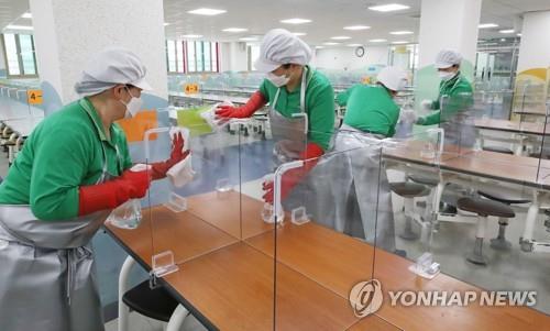 ▲ Workers disinfect a cafeteria at an elementary school in Seoul on Feb. 22, 2022, ahead of the beginning of the new semester next month. (Pool photo) (Yonhap)