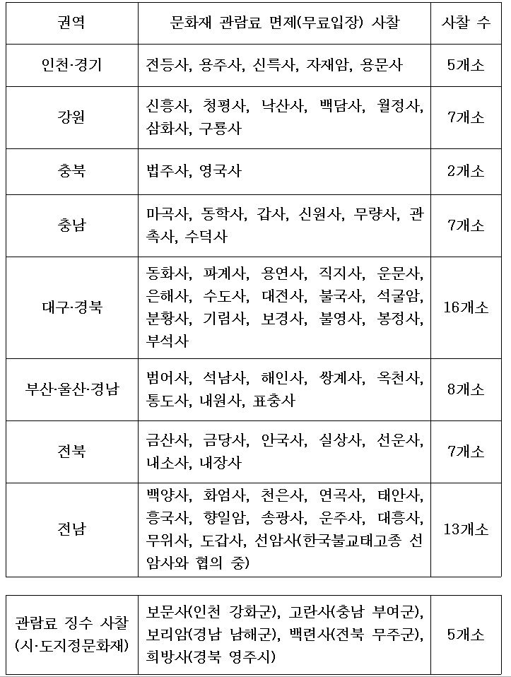 그간 관람료를 징수했거나 혹은 종단 방침에 따라 징수가 원칙이지만 징수를 유예해 온 전국 65개 사찰의 관람료가 이번 조치에 따라 면제된다고 조계종은 전했다.