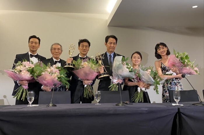 The creators and actors of "Squid Game" pose during a news conference after director Hwang Dong-hyuk (3rd from L) won the award for Outstanding Directing For A Drama Series and actor Lee Jung-jae (3rd from R) won the award for Outstanding Lead Actor In A Drama Series during the 74th Emmy Awards in Los Angeles on Sept. 12, 2022. From left are actors Park Hae-soo and Oh Young-soo, Hwang, Lee, producer Kim Ji-yeon and actress Jung Ho-yeon. (Yonhap)