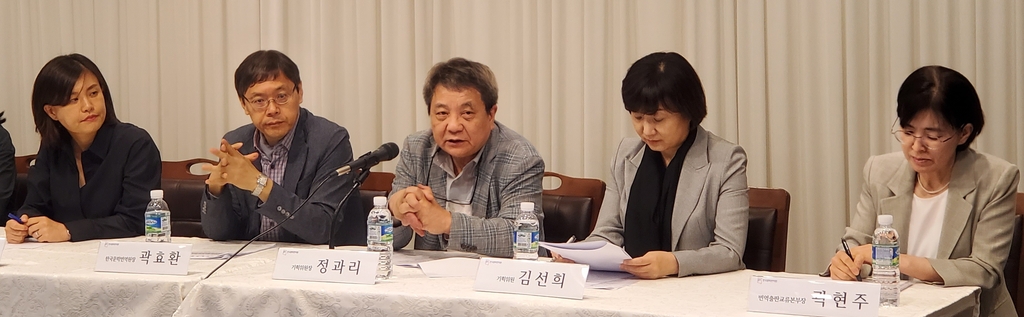 | ▲ 간담회 참석한 곽효환 한국문학번역원장 (서울=연합뉴스) 이세원 기자 = 곽효환(왼쪽에서 두번째) 한국문학번역원장이 15일 서울 종로구의 한 음식점에서 열린 기자 간담회에 참석 중이다. 2023.5.15 |