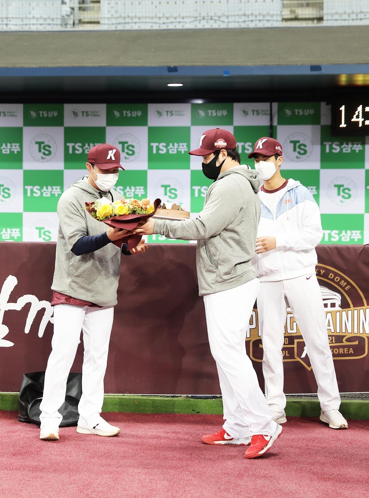 ▲ 김하성 송별회에서 주장 박병호가 꽃다발을 전달하고 있다. [키움 히어로즈 제공. 재판매 및 DB 금지]