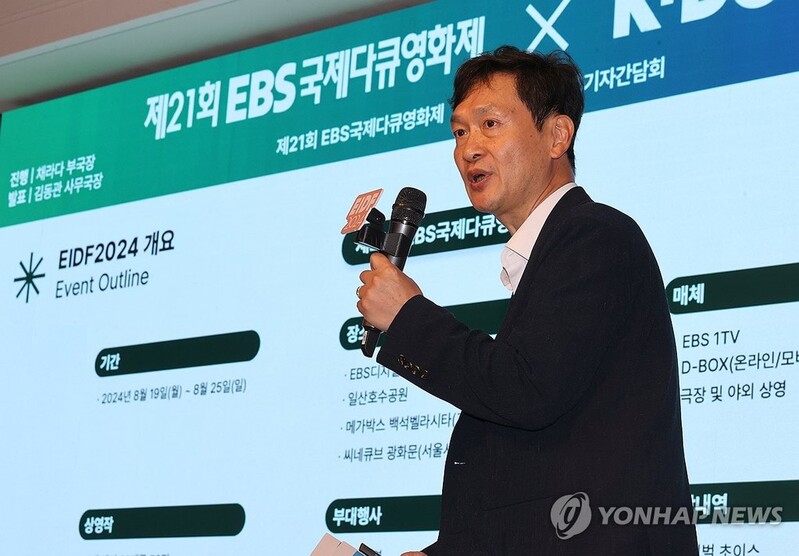| ▲ 제21회 EBS 국제다큐영화제 내달 19일 개막 (서울=연합뉴스) 류효림 기자 = 김동관 EBS 국제다큐영화제 사무국장이 30일 오후 서울 마포구 서교동 클럽온에어에서 열린 제21회 EBS 국제다큐영화제(EIDF2024) 기자간담회에서 영화제 소개 및 운영 계획을 설명하고 있다. 2024.7.30 ryousanta@yna.co.kr |