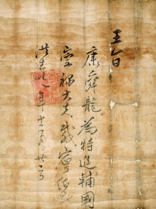 (서울=연합뉴스) 박상현 기자 = 서울대 규장각한국학연구원에는 '강순룡 왕지(王旨)'라는 문서가 있다. 조선 태조 4년인 1395년 12월 22일 강순룡을 '특진보국숭록대부 재령백'(特進輔國崇祿大夫 載寧伯)에 봉한다는 임명장이다.
