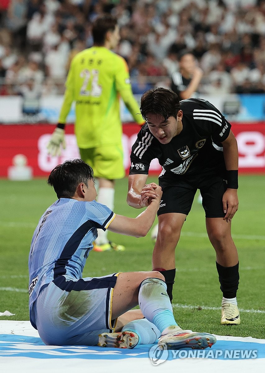 | ▲ 손흥민과 윤도영 (서울=연합뉴스) 박동주 기자 = 31일 서울월드컵경기장에서 열린 2024 쿠팡플레이 시리즈 토트넘과 팀 K리그의 경기. 팀 K리그 윤도영이 넘어졌다 일어나는 토트넘 손흥민의 손을 잡아주고 있다. 2024.7.31 pdj6635@yna.co.kr |