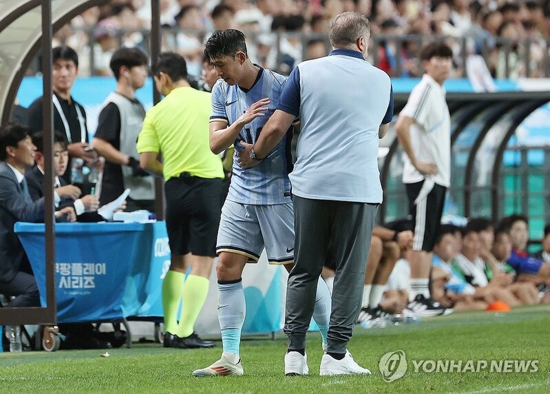| ▲ 멋진 활약 보인 손흥민 (서울=연합뉴스) 김성민 기자 = 31일 서울월드컵경기장에서 열린 2024 쿠팡플레이 시리즈 토트넘과 팀 K리그의 경기. 2골을 넣고 교체된 손흥민 안지 포스테코글루 감독의 격려를 받고 있다. 2024.7.31 ksm7976@yna.co.kr |