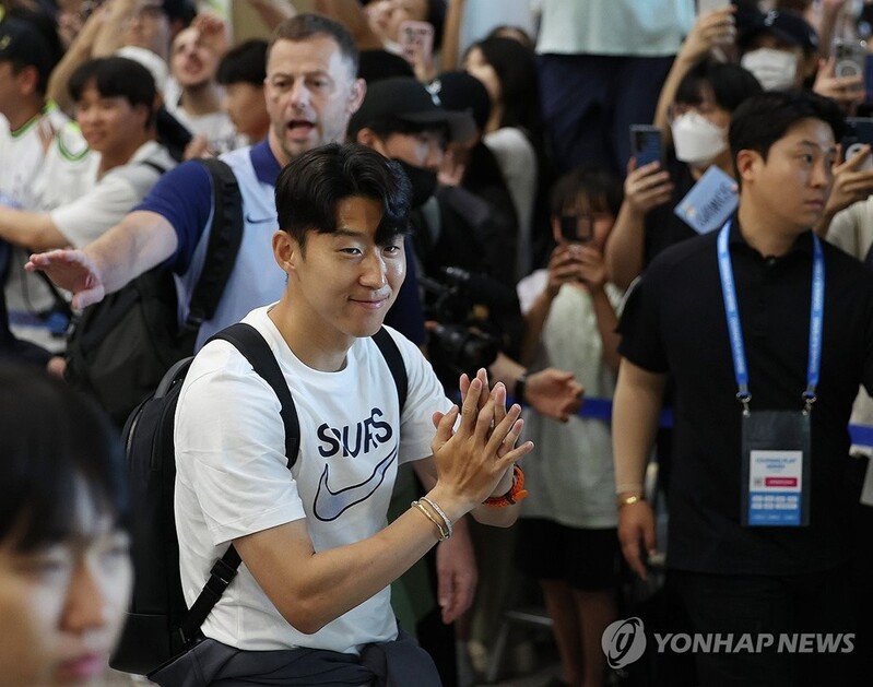 | ▲ 손흥민과 토트넘, 환영 인파 속 입국 (영종도=연합뉴스) 이지은 기자 = 잉글랜드 프로축구 토트넘의 손흥민과 선수들이 쿠팡플레이 시리즈 참가를 위해 28일 오후 인천국제공항을 통해 입국하며 손을 흔들고 있다. 토트넘에 이어 김민재의 소속팀인 독일의 명문 바이에른 뮌헨도 이번 시리즈에 참가해 3일 서울월드컵경기장에서 토트넘과 경기를 펼친다. 2024.7.28 jieunlee@yna.co.kr |