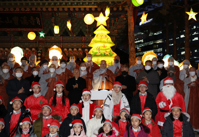 Buddhist monks, Christian leaders and children pose for a photo in a ceremony to light a Christmas tree-shaped lantern at Jogye Temple in downtown Seoul on Dec. 14, 2022. The temple is run by South Korea's largest Buddhist order of Jogye. (Yonhap)