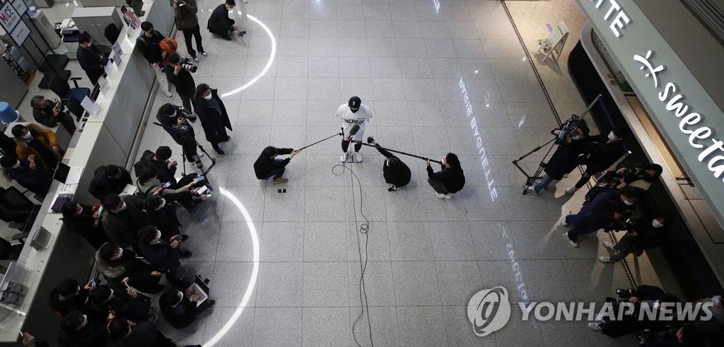 | ▲ 귀국한 추신수 (영종도=연합뉴스) 김도훈 기자 = 미국 프로야구 메이저리그 텍사스 레인저스에서 활약하다 신세계그룹 이마트 야구단에 입단한 추신수가 25일 오후 인천국제공항 제2터미널을 통해 귀국해 입국장에서 취재진과 인터뷰를 하고 있다. 2021.2.25 superdoo82@yna.co.kr |