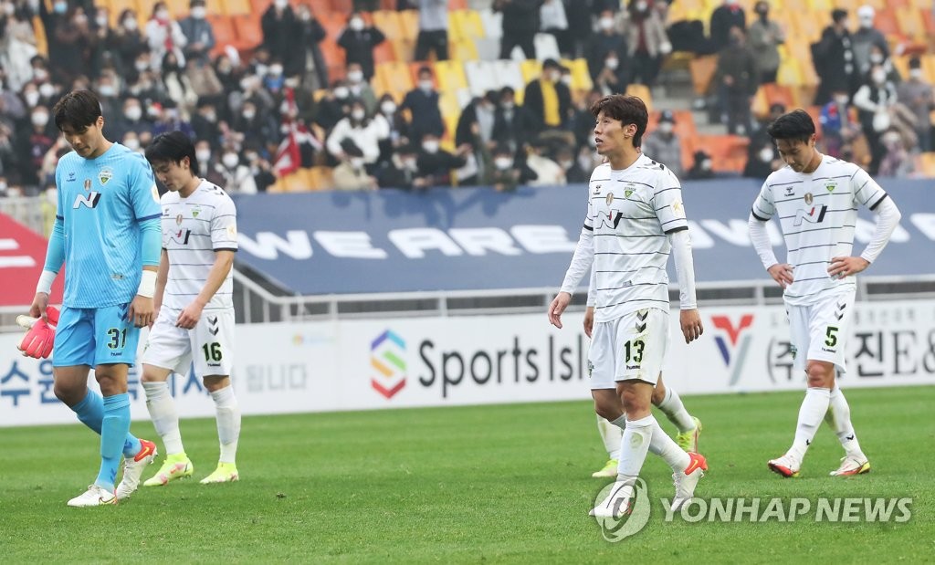 | ▲ Jeonbuk Hyundai Motors players walk off the field at Suwon World Cup Stadium in Suwon, some 45 kilometers south of Seoul, after losing to Suwon FC 3-2 in the clubs' K League 1 match on Nov. 21, 2021. (Yonhap) |