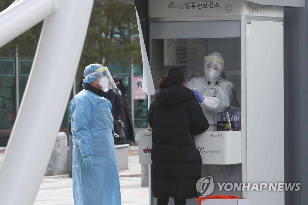 | ▲ This photo taken on March 2, 2021, shows a citizen receiving a virus test at a makeshift COVID-19 testing clinic in Dongducheon, north of Seoul. (Yonhap) |