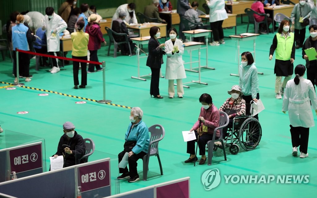 | ▲ Senior citizens wait in line to see doctors before getting vaccinated at a gymnasium in Gwangju on April 19, 2021. (Yonhap) |