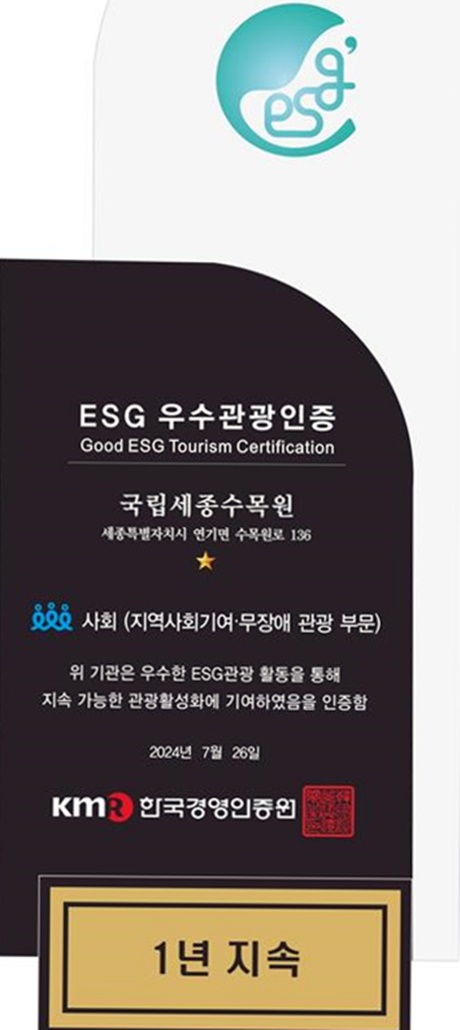 국립세종수목원 'ESG 우수관광인증' 획득…사회분야 국내 1호
