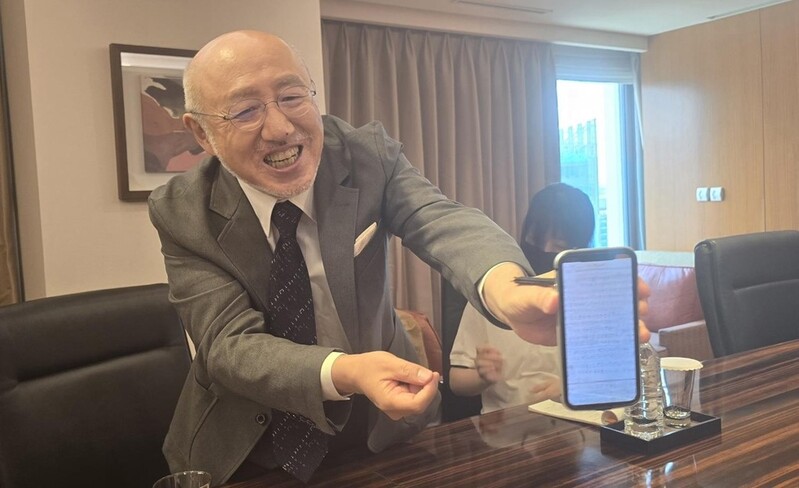 | ▲ 취재진에게 한국어 연습 노트 사진을 보여주는 유키 구라모토 (서울=연합뉴스) 유키 구라모토가 1일 서울 중구 롯데호텔 서울에서 취재진과 인터뷰 중 휴대전화에 저장된 한국어 연습 노트를 보여주고 있다. 2024.08.01 hyun@yna.co.kr |