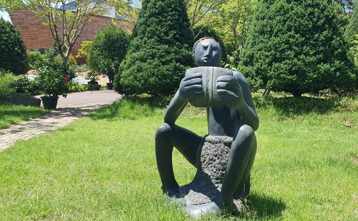 (신안=연합뉴스) 조근영 기자 = 전남 신안군이 보유 중인 아프리카 쇼나조각 150여 점이 만개한 맥문동꽃 보랏빛 물결 사이에서 관람객들을 맞이한다.