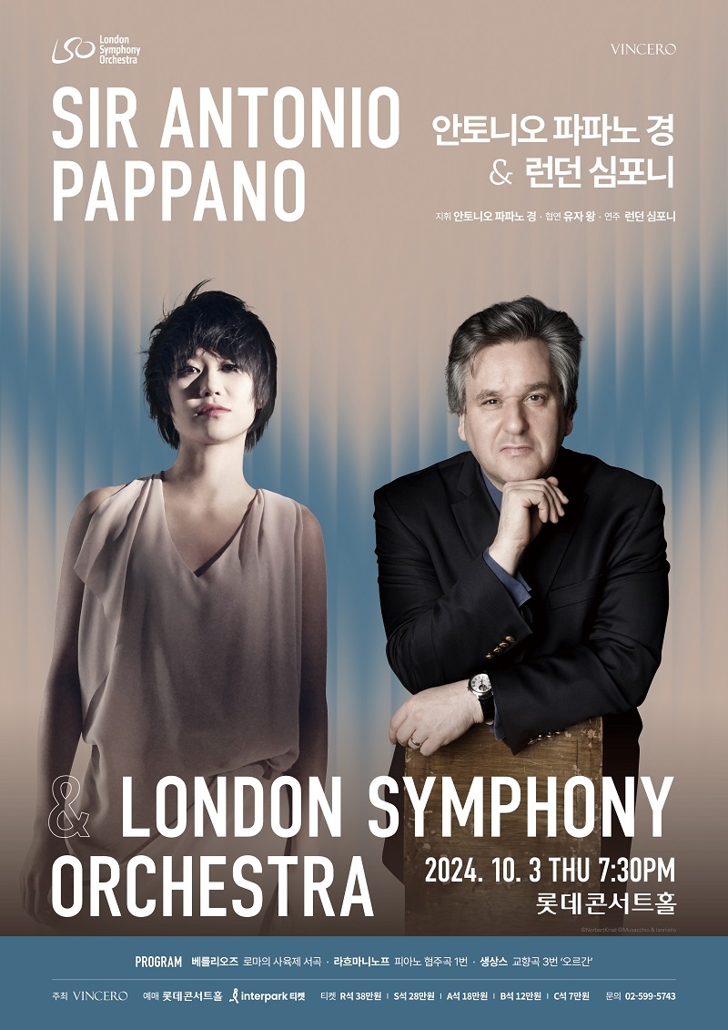 (서울=연합뉴스) 임순현 기자 = ▲ 안토니오 파파노의 런던심포니, 유자왕과 협연 = 공연기획사 빈체로는 10월 3일 서울 송파구 롯데콘서트홀에서 영국 런던 심포니 오케스트라가 중국 피아니스트 유자왕과 협연한다고 29일 밝혔다. 세계적인 지휘자 안토니오 파파노가 런던 심포니 오케스트라를 이끈다. 파파노는 오는 9월 이 오케스트라의 수석 지휘자로 공식 취임한다. 파파노는 피아니스트로 시작해 반주자 및 성악연습 코치, 지휘자로 유럽과 북아메리카의 유수의 오페라하우스에서 활동했으며, 오페라 레퍼토리로 세계 최고 수준의 실력을 인정받고 있다. 유자왕은 '21세기 건반 여제'로 불리는 중국이 배출한 세계적인 피아니스트다. 지난 2월에는 중국 피아니스트로는 최초로 그래미 어워즈를 수상했다. 라흐마니노프의 '피아노 협주곡 1번'과 생상스의 '교향곡 3번' 등을 연주한다. 이들은 이날 공연에 앞서 10월 1일 세종문화회관 대극장에서도 협연한다. 라흐마니노프의 '피아노 협주곡 4번'과 말러의 '교향곡 1번'을 연주할 예정이다.