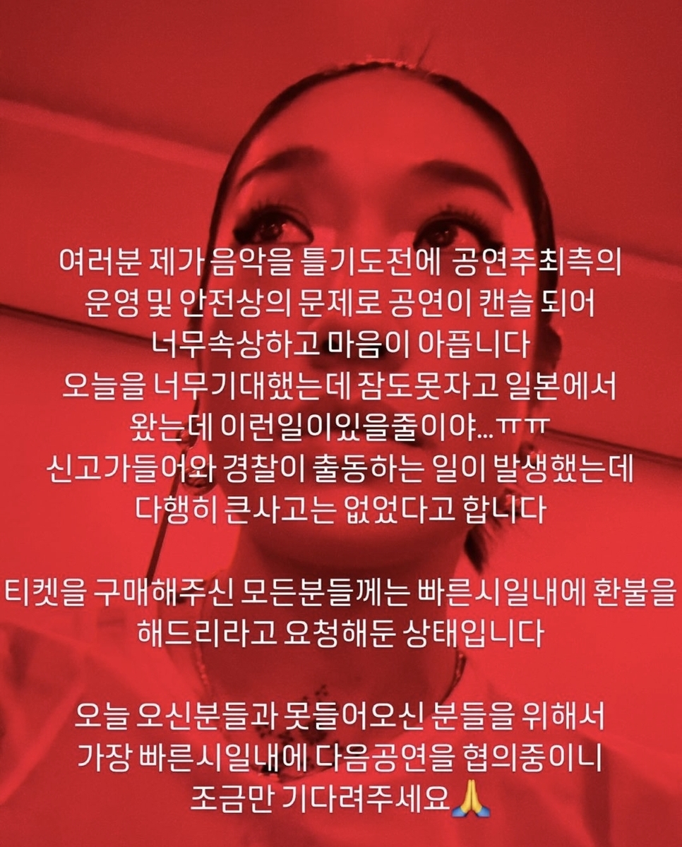 페기 구는 이날 자신의 사회관계망서비스(SNS)에 "음악을 틀기도 전에 안전상의 문제로 공연이 취소되어 너무 속상하고 마음이 아프다"며 "너무 기대했는데 이런 일이 있을 줄은 몰랐다. 오신 분들을 위해 빠른 시일 내에 다음 공연을 협의하고 있다"고 밝혔다.
