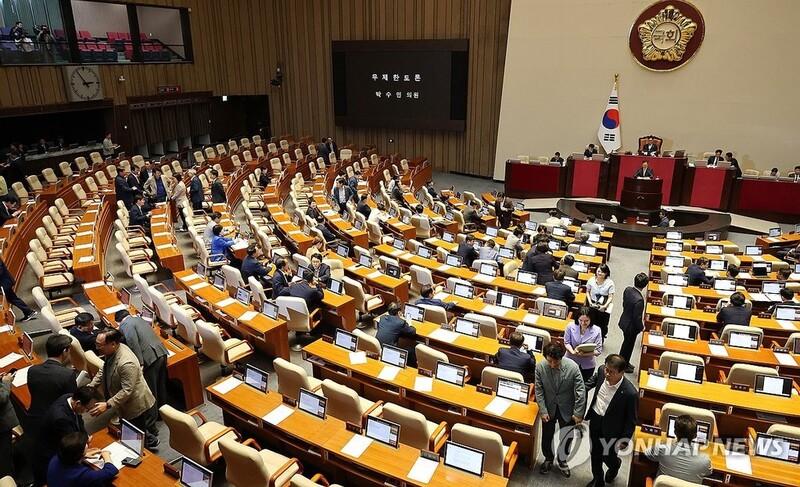 | ▲ Opposition lawmakers leave a plenary session of the National Assembly in Seoul on Aug. 1, 2024, as the ruling People Power Party launches a filibuster to block the passage of a bill on providing cash handouts to the entire population. (Yonhap) |