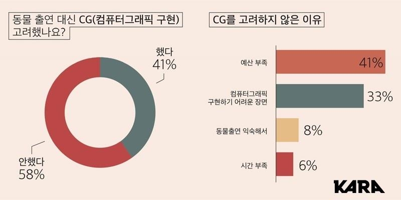 카라가 2020년 6월 감독조합, PD조합 등 영화·방송계 관계자 157명을 대상으로 설문 조사한 결과를 보면 동물 출연 대신 CG를 고려한 적이 있느냐는 질문에 58%가 '없다'고 답했다.