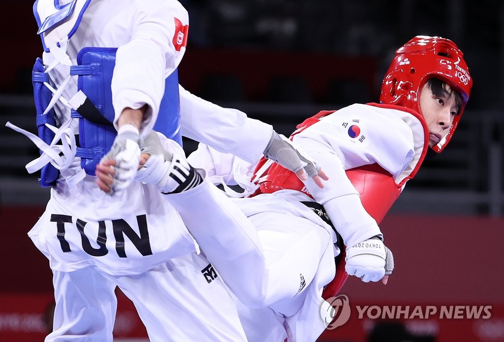 | ▲ [올림픽] 막혀버린 장준의 발차기 (도쿄=연합뉴스) 손형주 기자 = 장준이 24일 도쿄 마쿠하리 메세 A홀에서 열린 도쿄올림픽 남자 태권도 58㎏급 준결승에서 튀니지 칼릴에게 공격하고 있다. 2021.7.24 handbrother@yna.co.kr |