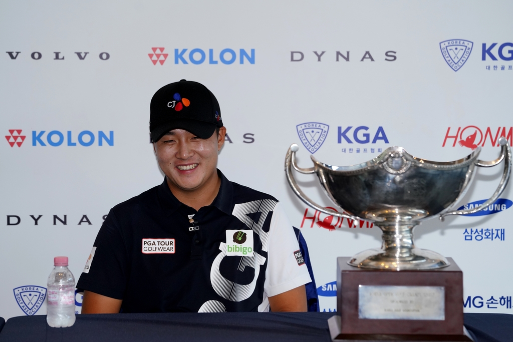 | ▲ 우승컵을 앞에 두고 인터뷰하는 김민규 [코오롱 한국오픈 조직위원회 제공. 재판매 및 DB 금지] |