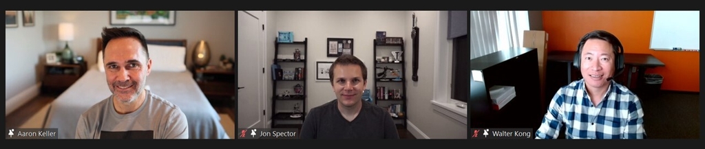 | ▲ 국내 취재진과 화상 인터뷰하는 오버워치2 개발진 왼쪽부터 아론 켈러 오버워치2 디렉터, 존 스펙터 커머셜 리드, 월터 콩 매니저 [블리자드엔터테인먼트 제공. 재판매 및 DB 금지] |