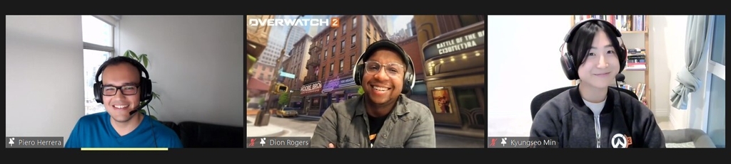 | ▲ 국내 취재진과 화상 인터뷰하는 오버워치2 개발진 왼쪽부터 피에로 에레라 영웅 디자이너, 디온 로저스 아트 디렉터, 민경서 내러티브 디자이너 [블리자드엔터테인먼트 제공. 재판매 및 DB 금지] |