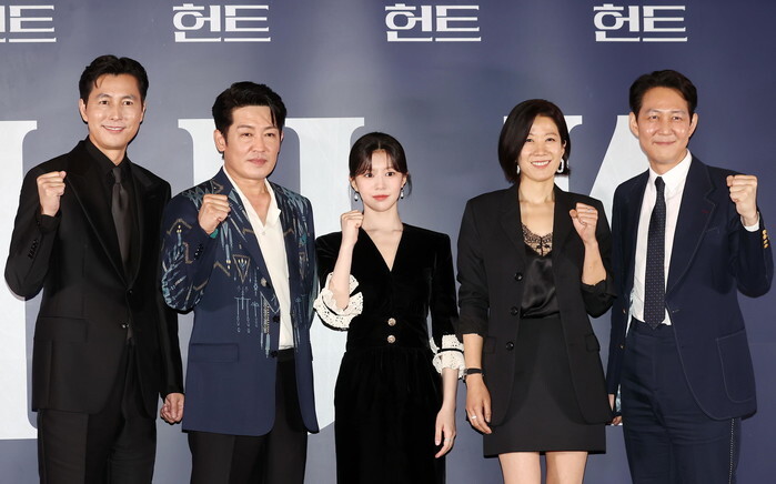 The stars of the new movie "Hunt" --(from L to R) Jung Woo-sung, Heo Sung-tae, Ko Yoon-jung, Jeon Hye-jin and Lee Jung-jae -- pose for a photo during a publicity event in Seoul on July 27, 2022. The movie will be released in South Korea on Aug. 10. (Yonhap)