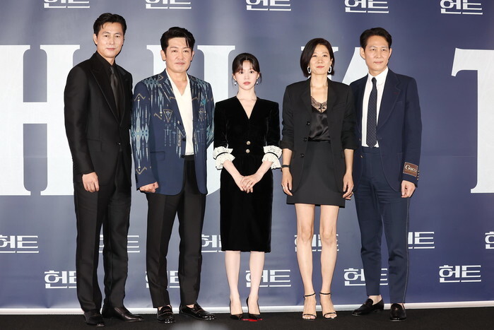 The stars of the new movie "Hunt" -- (from L to R) Jung Woo-sung, Heo Sung-tae, Ko Yoon-jung, Jeon Hye-jin and Lee Jung-jae-- pose for a photo during a publicity event in Seoul on July 27, 2022. The movie will be released in South Korea on Aug. 10. (Yonhap)