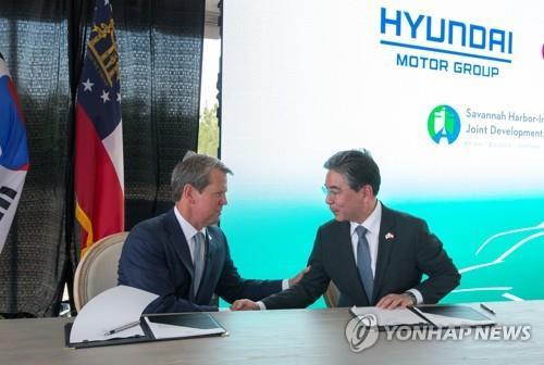 | ▲ This file photo, provided by Hyundai Motor Co. on May 21, 2022, shows Georgia Gov. Brian Kemp (L) and Hyundai Motor President Jang Jae-hoon shaking hands after signing an agreement on the construction of an electric vehicle plant in Georgia, the United States. (PHOTO NOT FOR SALE) (Yonhap) |