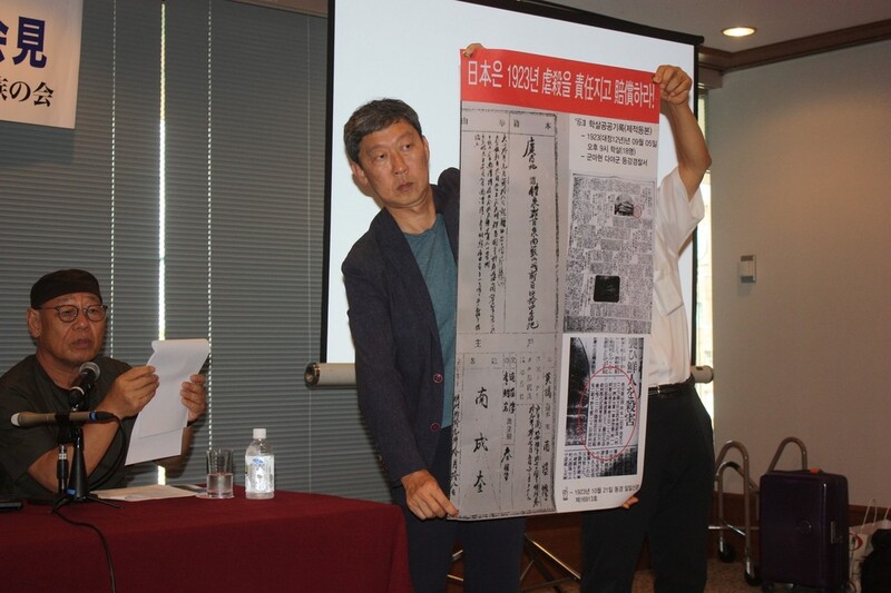 이날 기자회견 자리에는 간토대지진 조선인 학살 문제를 여러 편의 다큐멘터리로 다뤄온 재일동포 영화감독 오충공 씨와 민주사회를 위한 변호사 모임의 권태윤 변호사 등도 함께 했다.