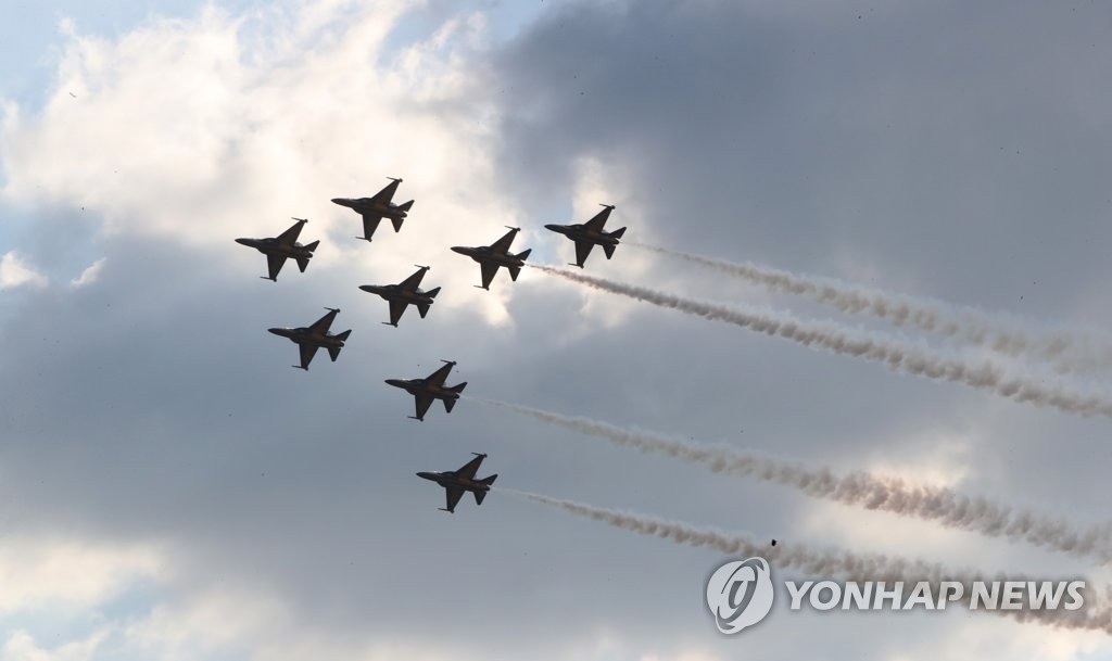 | ▲ The South Korean Air Force's aerobatic team, the Black Eagles, stages a performance at the Gyeryong World Military Culture Expo on a runway just next to the Gyeryongdae military headquarters, 160 kilometers south of Seoul, on Oct. 7, 2022. (Yonhap) |