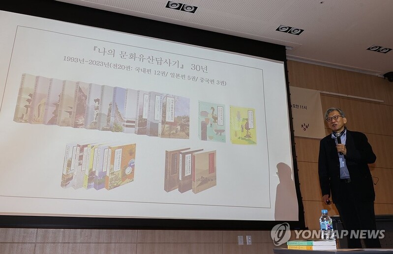 | ▲ 신간 '국토박물관 순례' 소개하는 유홍준 교수 (서울=연합뉴스) 류효림 기자 = 미술사학자 유홍준 명지대학교 석좌교수가 21일 서울 마포구 서교동 창비서교빌딩에서 열린 국토박물관 순례 출간 기념 기자간담회에서 책을 소개하고 있다. 2023.11.21 ryousanta@yna.co.kr |