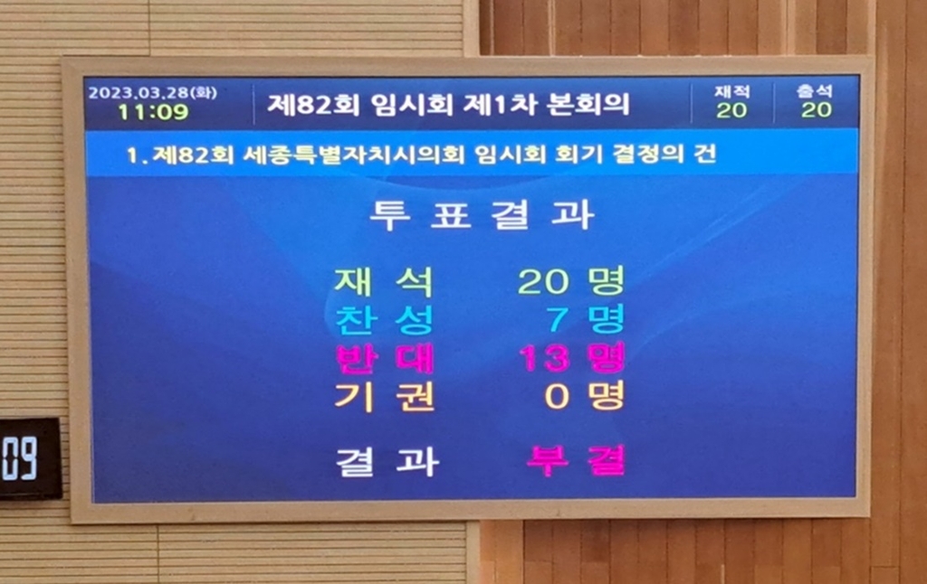 시의회는 28일 제82회 임시회 본회의에서 '세종시 문화재단 설립 및 운영에 관한 조례 개정안'의 행정복지위원회 상정 여부를 표결에 부친 결과 반대 13명, 찬성 7명으로 부결됐다.