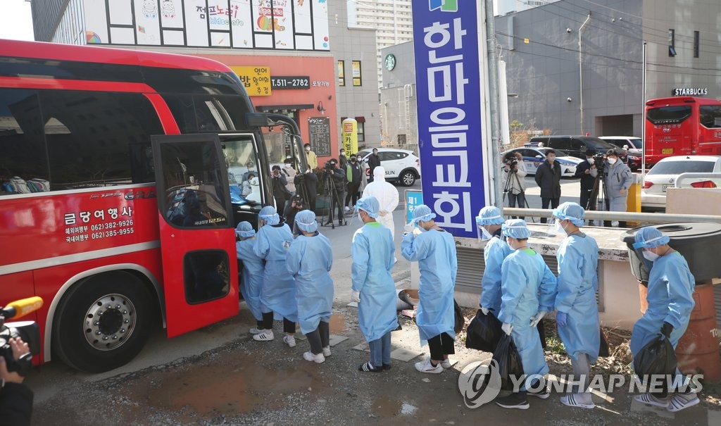 | ▲ People who tested positive for the new coronavirus from a religious educational facility in Gwangju, about 330 kilometers south of Seoul, get on a bus headed to a treatment center on Jan. 27, 2021. (Yonhap) |