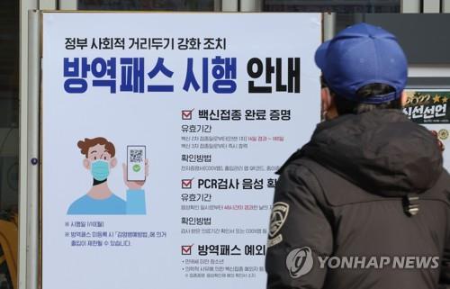 | ▲ A person reads a sign on the COVID-19 vaccine pass system posted on the door of a discount store in Seoul on Jan. 10, 2022. (Yonhap) |