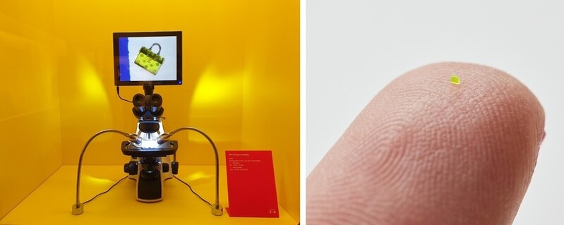 | ▲ (왼쪽) 서울 대림미술관에서 전시되는 미스치프의 초소형 핸드백 작품. 현미경으로 볼 수 있도록 전시됐다. 오른쪽은 초소형 핸드백의 모습[주피터 제공. 재판매 및 DB 금지] |