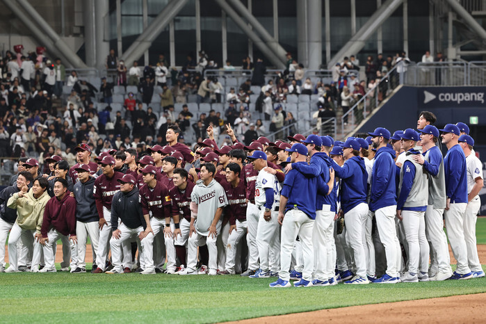 Members of the Kiwoom Heroes (in burgundy tops) and Los Angeles Dodgers pose for group photos after playing an exhibition game at Gocheok Sky Dome in Seoul on March 17, 2024. (Yonhap)