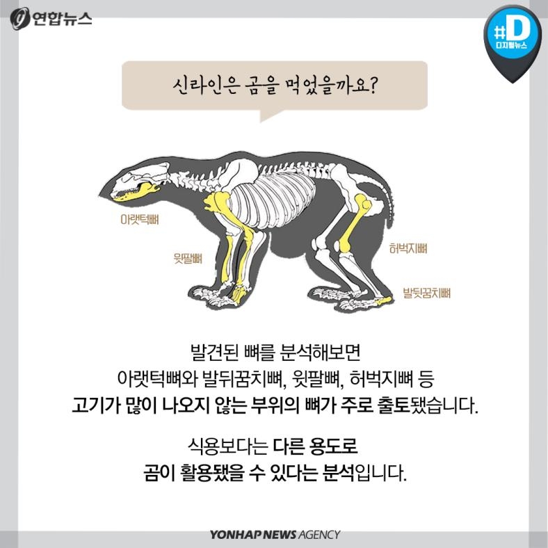 당시 왕은 군을 장악하고 있었기에 신라의 궁궐 주변에서 발견된 곰 뼈는 군대 깃발 제작 후 남겨진 뼈로 추정해볼 수 있죠.