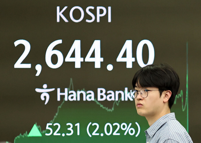 A financial data screen in the dealing room of Hana Bank in Seoul on May 26, 2025, shows the benchmark Korea Composite Stock Price Index having risen 52.31 points, or 2.02 percent, to close at 2,644.40. South Korean stocks closed sharply higher, driven by gains in tech shares, as investor sentiment was buoyed by U.S. President Donald Trump's extension of the deadline for imposing sweeping tariffs on the European Union. (Yonhap)