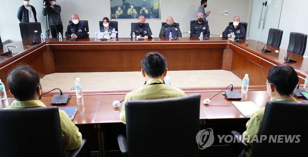 | ▲ Government officials and members of the Korean Public Service and Transportation Workers' Union Cargo Truckers Solidarity Division are seated to resume their negotiations on the truckers' strike at the main government complex in Sejong on Nov. 30, 2022. (Yonhap) |