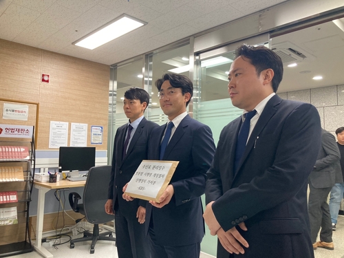 | ▲ KBS "수신료 분리징수 멈춰달라" 가처분 신청 (서울=연합뉴스) 오명언 기자 = 21일 오후 KBS 법무실 윤태윤 변호사(왼쪽) 등 관계자들이 서울 종로구 헌법재판소에 방송통신위원회를 상대로 한 '방송법 시행령 개정 절차 진행 정지' 가처분 신청서를 제출하고 있다. 2023.6.21 coup@yna.co.kr |