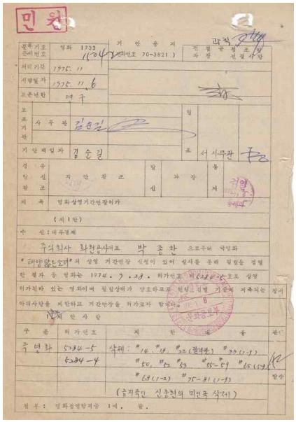 | ▲ 영화 '태양 닮은 소녀' 검열 서류 [한국영상자료원 제공. 재판매 및 DB 금지] |