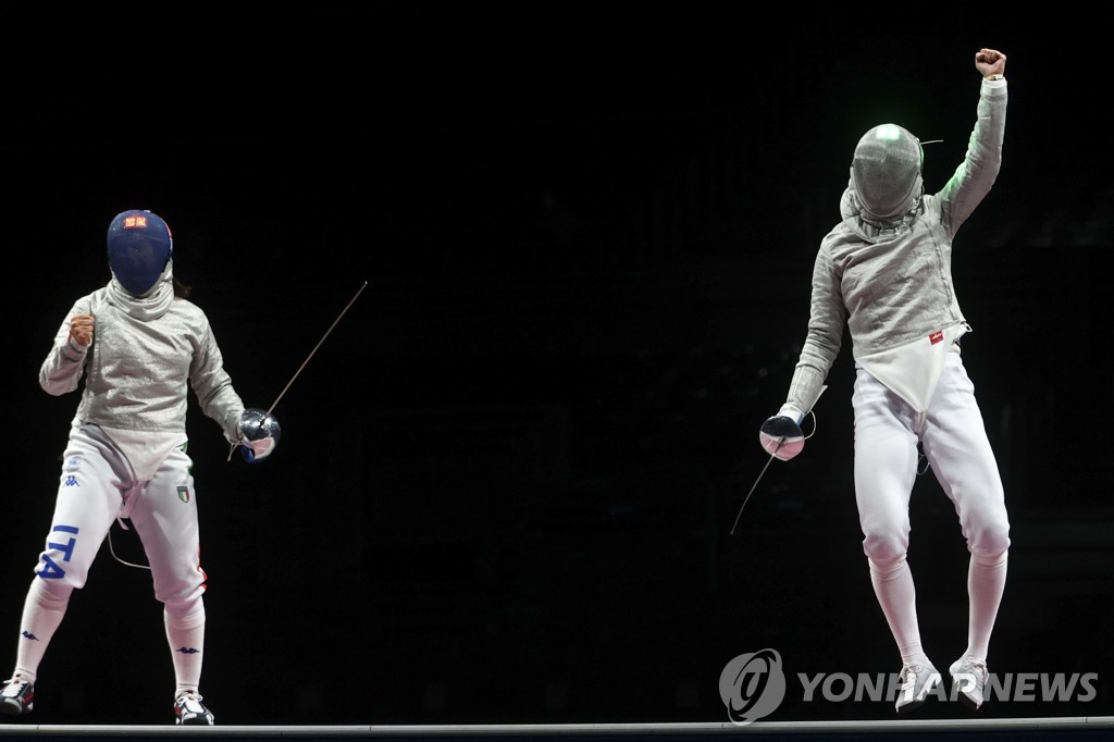 | ▲ In this Reuters photo, Yoon Ji-su of South Korea celebrates a point against Rossella Gregorio of Italy during the bronze medal match of the women's sabre team fencing event at the Tokyo Olympics at Makuhari Messe Hall B in Chiba, Japan, on July 31, 2021. (Yonhap) |