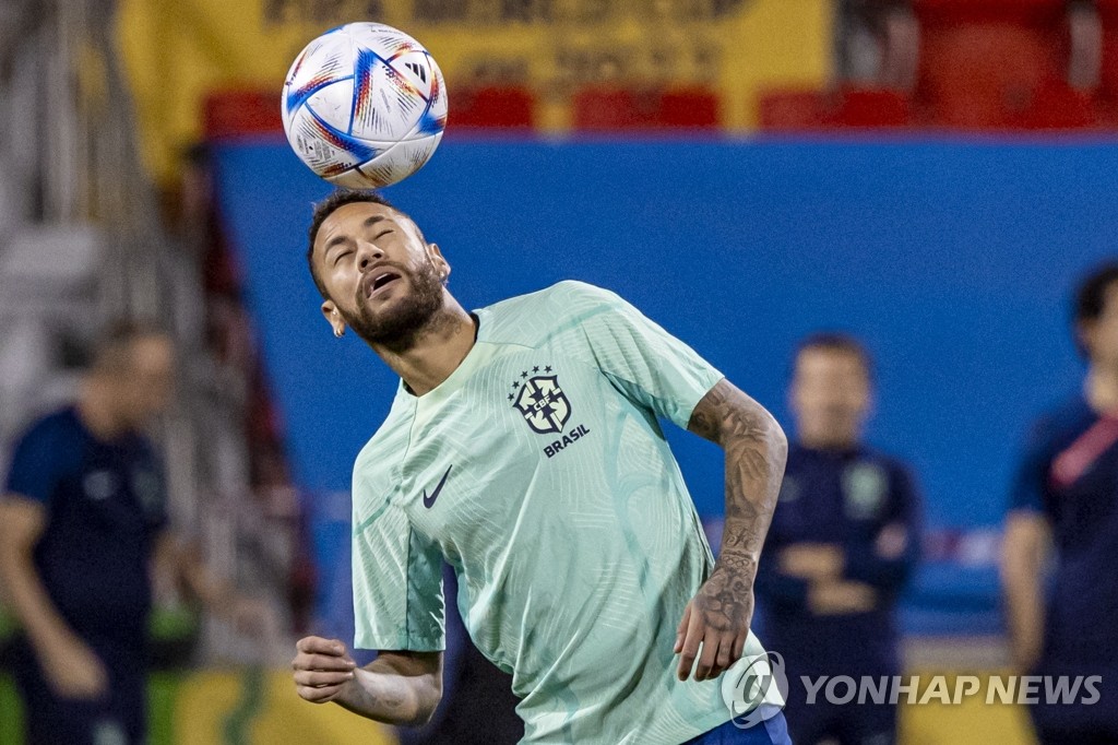 | ▲ 헤딩 연습하는 네이마르 (도하 EPA=연합뉴스) 브라질 축구 국가대표팀의 네이마르가 4일(현지시간) 카타르 도하에서 다음날 예정된 카타르 월드컵 16강 한국전을 대비해 훈련을 하고 있다. 2022.12.05 2022435@yna.co.kr |