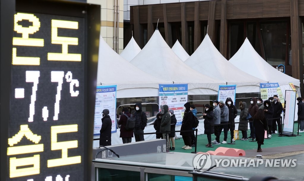 | ▲ People wait in line to receive tests amid a cold snap at a COVID-19 testing station in Seoul on Feb. 16, 2022, when the country reported 90,443 new cases. (Yonhap) |