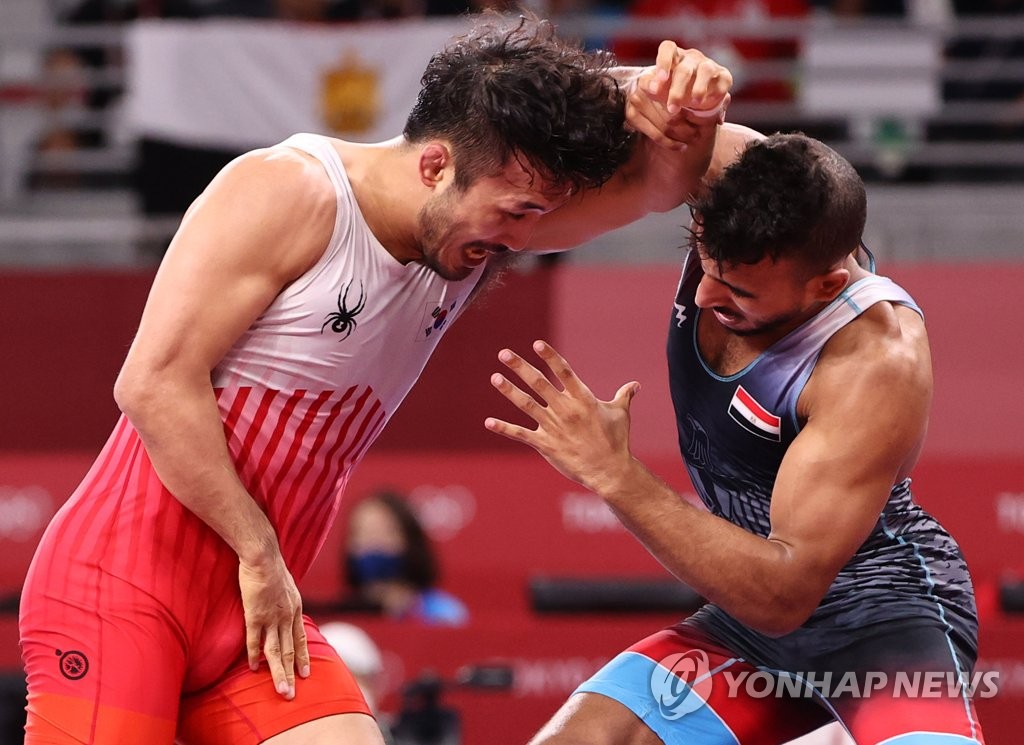 | ▲ Ryu Han-su of South Korea (L) wrestles with Mohamed Ibrahim El-Sayed of Egypt in the round of 16 in the men's 67kg Greco-Roman wrestling event at Makuhari Messe Hall A in Chiba, Japan, on Aug. 3, 2021. (Yonhap) |