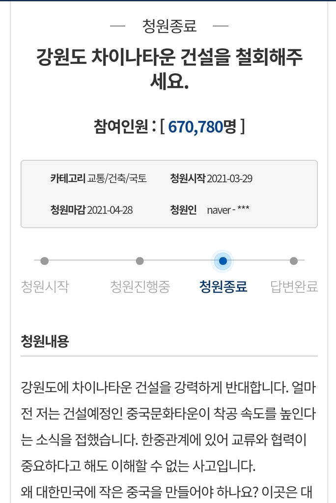 올해 3월 28일 게시된 해당 국민청원은 지난달 28일로 종료됐으며, 공식 답변을 남겨두고 있다.